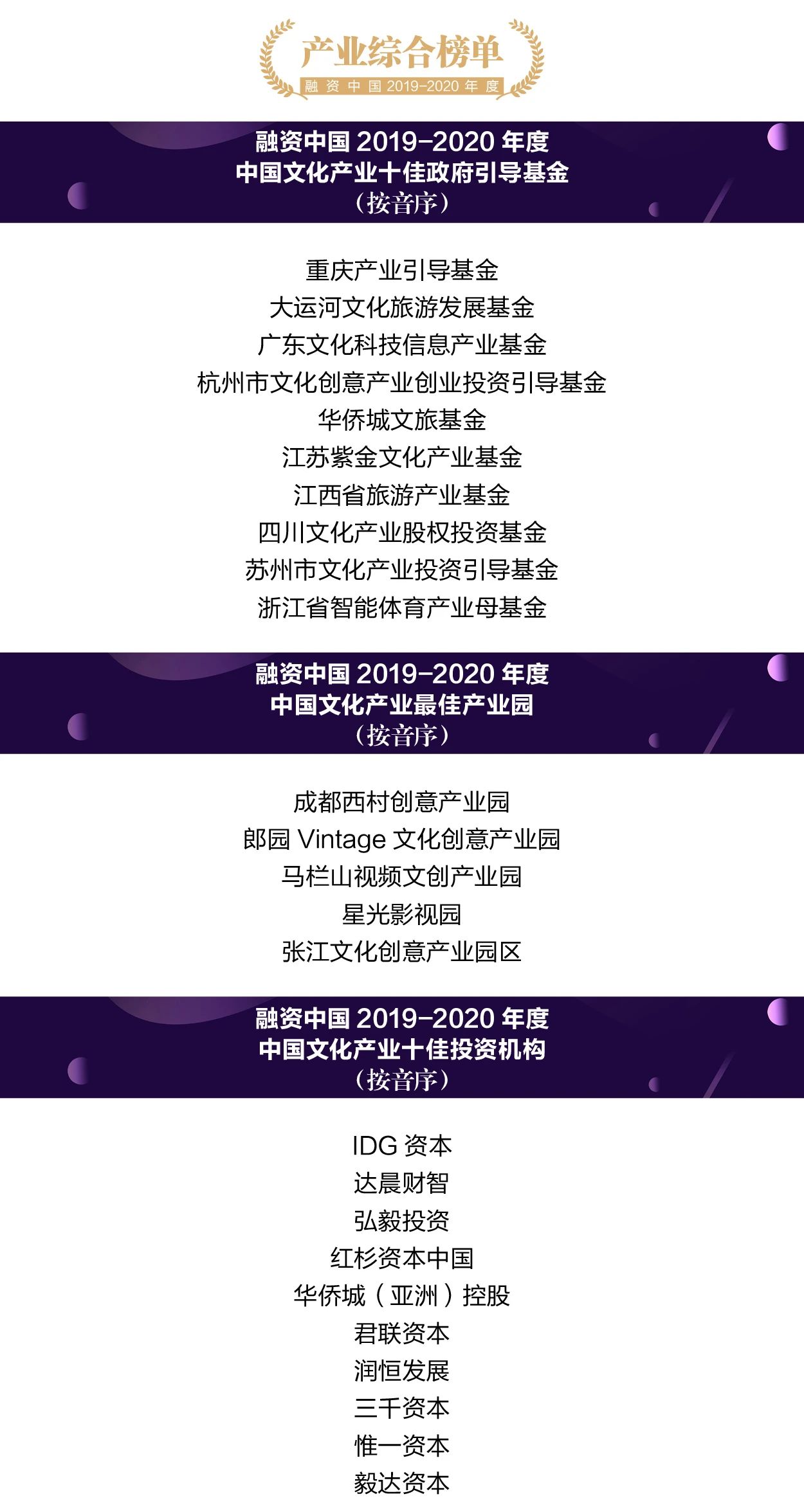 多年以來,融中研究始終以研究視野客觀選擇評判,以媒體角度公正審核結果、數據排查,力爭打造客觀、公正權威的綜合性榜單。融資中國聯合業內資深人士,通過問卷調研、數據評測等形式,隆重發布“融資中國2019-2020年度中國大文化產業榜單”。
