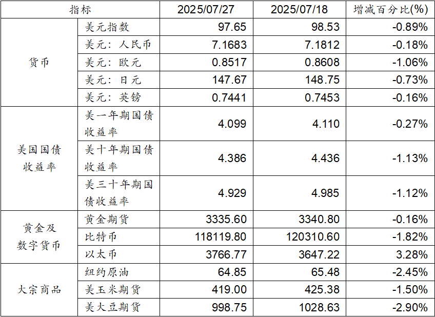 7月18日至7月17日,美元指數下跌0.89%,美元兌人民幣匯率下跌0.18%。美國一年期十年期及三十年期國債收益率均呈現下跌態勢。黃金期貨價格下跌0.16%。比特幣下跌1.82%。以太幣上漲3.28%。大宗商品中紐約原油、玉米期貨及大豆期貨價格均呈現下跌態勢。