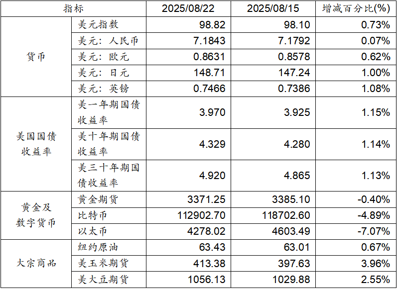 8月15日至8月22日,美元指數(shù)上漲0.73%,美元兌人民幣匯率上漲0.07%。美國一年期、十年期及三十年期國債收益率均呈現(xiàn)上漲態(tài)勢。黃金期貨價格下跌0.40%。比特幣下跌4.89%。以太幣下跌7.07%。大宗商品紐約原油、玉米期貨及大豆期貨價格均呈現(xiàn)上漲態(tài)勢。